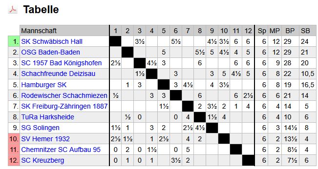 Auch das Parallelspiel ging an die Gäste, Deizisau schlug Chemnitz mit 4,5-1,5 und hat sich damit still und leise auf Tabellenplatz 4 hinter den großen Drei aus Baden-Baden, Schwäbisch Hall und Bad Königshofen vorgearbeitet.
