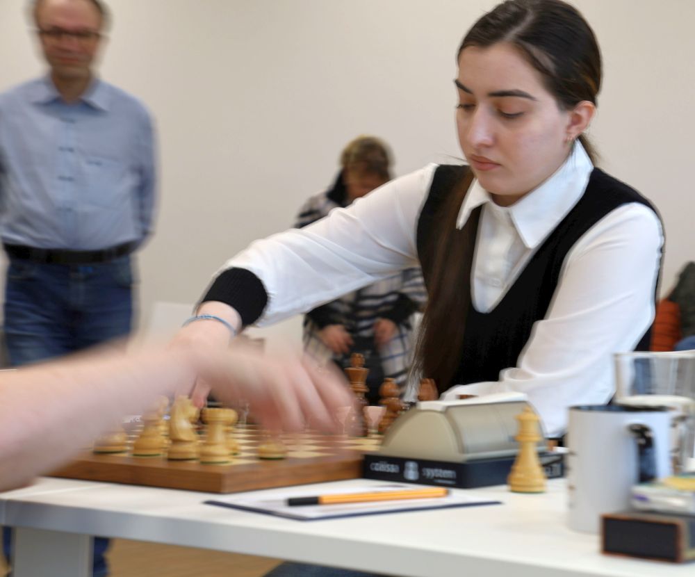 Zunächst ging es für Schwäbisch Hall gegen Gastgeber Chemnitz. Am Ende gab es einen klaren 6-0 Sieg, aber einige Partien waren knapper als das klare Ergebnis vermuten lässt. So dauerte Partie am Spitzenbrett zwischen Meri Arabidze und Anna Czäczine, die in der Vorrunde schon die deutsche Nummer 1 Elisabeth Pähtz schlagen konnte, über 5 Stunden. Meri Arabidze hatte im Mittelspiel klaren Vorteil, vergab diesen aber in der Zeitnotphase komplett, und es entstand ein kompliziertes Endspiel mit Mehrqualität für die Georgierin in Haller Reihen gegen zunächst drei Bauern. Obwohl Meri Arabidze langsam die Zeit ausging, versuchte sie immer noch auf Gewinn zu spielen und wurde am Ende belohnt, als in dem am Ende entstandenen Endspiel mit einem Mehrturm gegen mehrere vorgerückte Bauern ihrer Chemnitzer Gegnerin ein einziger Fehler unterlief und am Ende der Turm mattsetzen konnte. Auch die 20-jährige Bulgarin Nadya Toncheva hatte etwas Glück bei ihrem Bundesligadebüt, als sie im Mittelspiel gegen die erst 14-jährige Paula Czäczine zunächst in Nachteil geriet. In der Zeitnotphase kurz vor Zug 40 konnte sie die Stellung aber ausgleichen. Auch hier hatte die Schwäbisch Haller Spielerin eine Mehrqualität gegen diverse Bauern bei beiderseitig offenen Königen, und das wurde am Ende der Chemnitzer Spielerin zum Verhängnis. Wie am Spitzenbrett ließ die nominell stärkere Spielerin mehrere Möglichkeiten aus, in ein Remis durch Dauerschach abzuwickeln und machte ununterbrochen Druck auf die gegnerische Stellung, und der letzte Fehler unterlief dann der jungen Chemnitzerin. Weniger spektakulär verlief die Bundesligapremiere der 17-jährigen Georgierin Anastasia Kirtadze, die bei der letzten Fraueneuropameisterschaft in der ersten Turnierhälfte für Furore gesorgt hatte, als sie mit 5,5 aus 6 gestartet war. Sie opferte einen Bauern für massiven Druck im Zentrum und verwertete diesen Vorteil am Ende sicher. Ekaterina Atalik und Andreea Navrotescu gewannen ebenfalls.