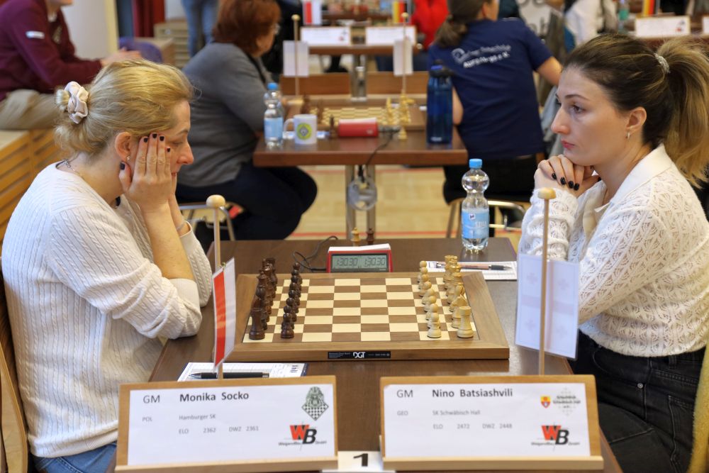 Und die Schwäbisch Haller Damen zeigten auch in der letzten Runde ihre Klasse. Gegen Hamburg gab es ein klares 5-1. Auch hier kann man wieder sagen, dass der Sieg am Ende gemessen am Spielverlauf sehr hoch ausfiel, aber wenn das immer wieder passiert, ist das auch ein Zeichen des Könnens der Spielerinnen gerade in der Crunch-Time. Los ging es mit einem Remis zwischen Irina Bulmaga und Antonia Ziegenfuß, in der Irina Bulmaga die ein oder andere Gewinnchance liegen ließ. Für die Führung sorgte Lela Javakhishvili gegen die starke Ungarin Zsoka Gaal. Alle anderen Partien gingen über die volle Distanz. Zunächst lieferten sich Bella Khotenashvili und die Blitzschach-Europameisterin Eline Roebers eine wilde Zeitnotschlacht, in der sich die Niederländerin zunächst eine klare Gewinnstellung erspielte, diese aber gleich wieder vergab. Nachdem sich nach 40 Zügen der Rauch verzogen hatte, stand eine klare Gewinnstellung für die Georgierin in Schwäbisch Haller Reihen auf dem Brett, und Roebers knallte kurz wütend ihren Kugelschreiber auf den Tisch, bevor sie eine kurze Toilettenpause nahm. Wenig später war dann die Partie auch zu Ende, und Schwäbisch Hall 2,5-0,5 vorne. Den Sack zu machte Ekaterina Atalik. Sie war die ganze Partie von der Nachwuchsspielerin Lepu Coco Zhou massiv unter Druck gesetzt worden und rettete sich in ein ausgeglichenes Endspiel mit ungleichfarbigen Läufern. Als jeder mit einem Remisschluss rechnete, übersah die Hamburger Spielerin einen letzten Trick, der einen Freibauern zur Dame gehen ließ, und es stand 3,5-0,5. Danach liefen nur noch zwei Partien im kompletten Spielsaal, und das waren beides die letzten Partien des neuen Meisters. Im GM-Duell an Brett 1 stand zwischen Nino Batsiashvili und Monika Socko nach hartem Fight ein remises Turmendspiel auf dem Brett. In der letzten Partie hatte Deimante Cornette gegen Sarah Papp einen Bauern mehr im Damenendspiel und brachte diesen Vorteil am Ende auch nach Hause zum 5-1 Endstand. Damit beendet die Schwäbisch Haller Mannschaft im 90. Jubiläumsjahr des Vereins die Saison mit beeindruckenden 22-0 Punkten.