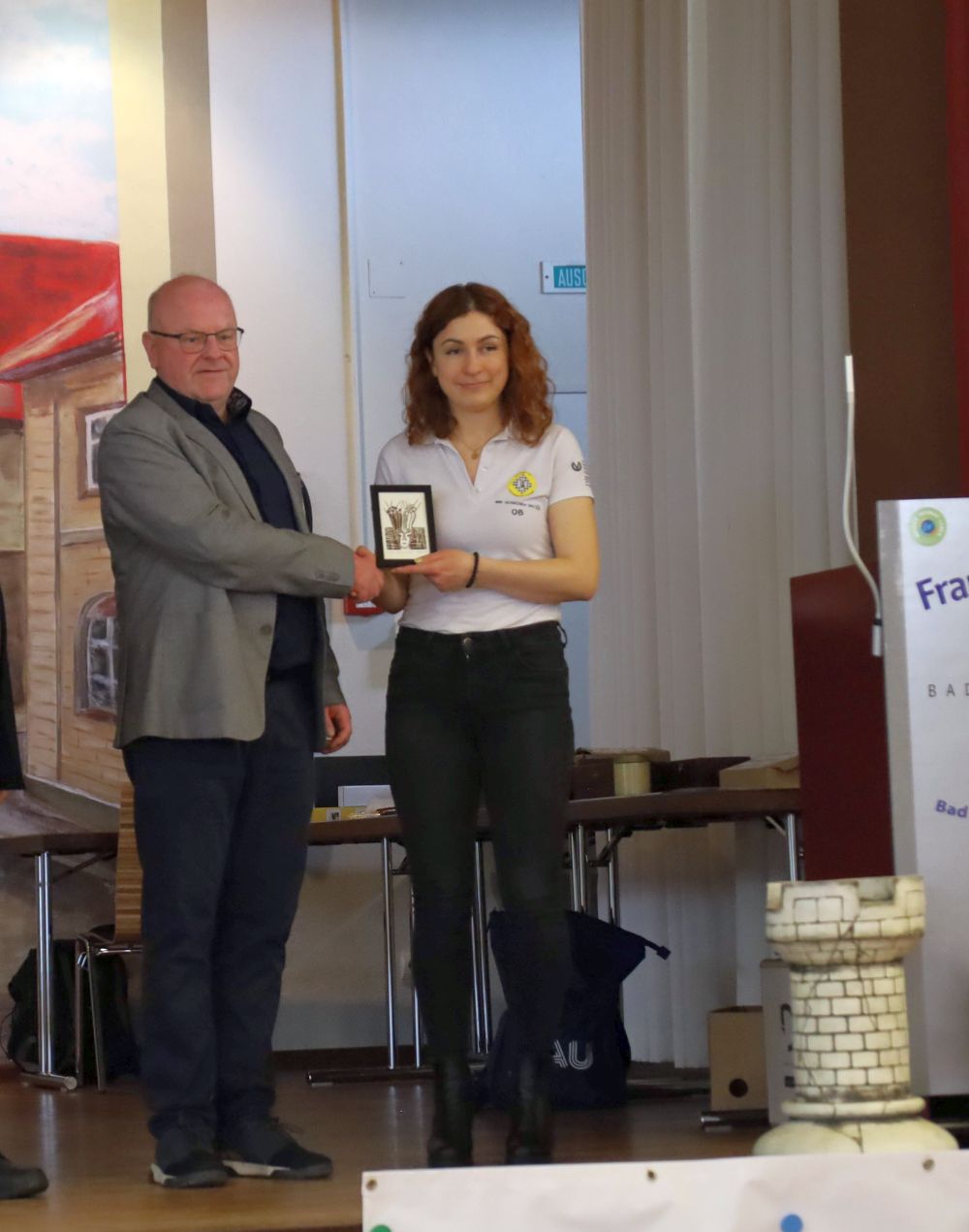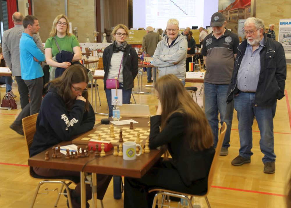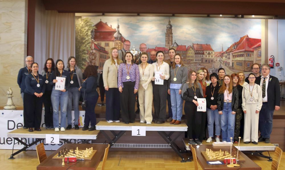 Der Franz-Jittenmeier-Gedächtnispreis, dieses Jahr ein Originalholzschnitt zur Schachnovelle der Hamburger Künstlerin Elke Rehder, ging dieses Jahr in der offenen Kategorie an Olga Babiy von Gastgeber Bad Königshofen mit beeindruckenden 8,5 Punkten aus 9 gespielten Partien – dazu kam noch ein kampfloser Punkt gegen Rodewisch. Da konnte auch Deimante Cornette vom neuen Meister Schwäbisch Hall mit ihren 8/9 nicht ganz mithalten. Knapp war es beim Nachwuchs. Zunächst verabschiedete sich Antonia Ziegenfuß mit ihrem Remis gegen aus dem Rennen Irina Bulmaga, über das sie sich natürlich trotzdem freute. Dann legte Machteld van Foreest aus Solingen mit dem Gewinn ihrer Partie gegen Kreuzberg vor, und damit war klar, dass ihre Mannschaftskameradin und Zimmergenossin Luisa Bashylina gewinnen musste, um vorne zu bleiben, und das gelang ihr am Ende auch mit 6/9.