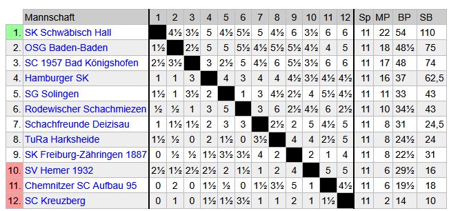 In der letzten Runde der Frauenbundesliga kam es zum großen Showdown um Meisterschaft und Klassenerhalt. An der Tabellenspitze spielten die Ligaschwergewichte gegeneinander. Der verlustpunktfreie Tabellenführer SK Schwäbisch Hall traf auf den Tabellendritten Hamburger SK und Verfolger OSG Baden-Baden auf den Tabellenvierten und Titelverteidiger SC Bad Königshofen.